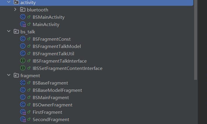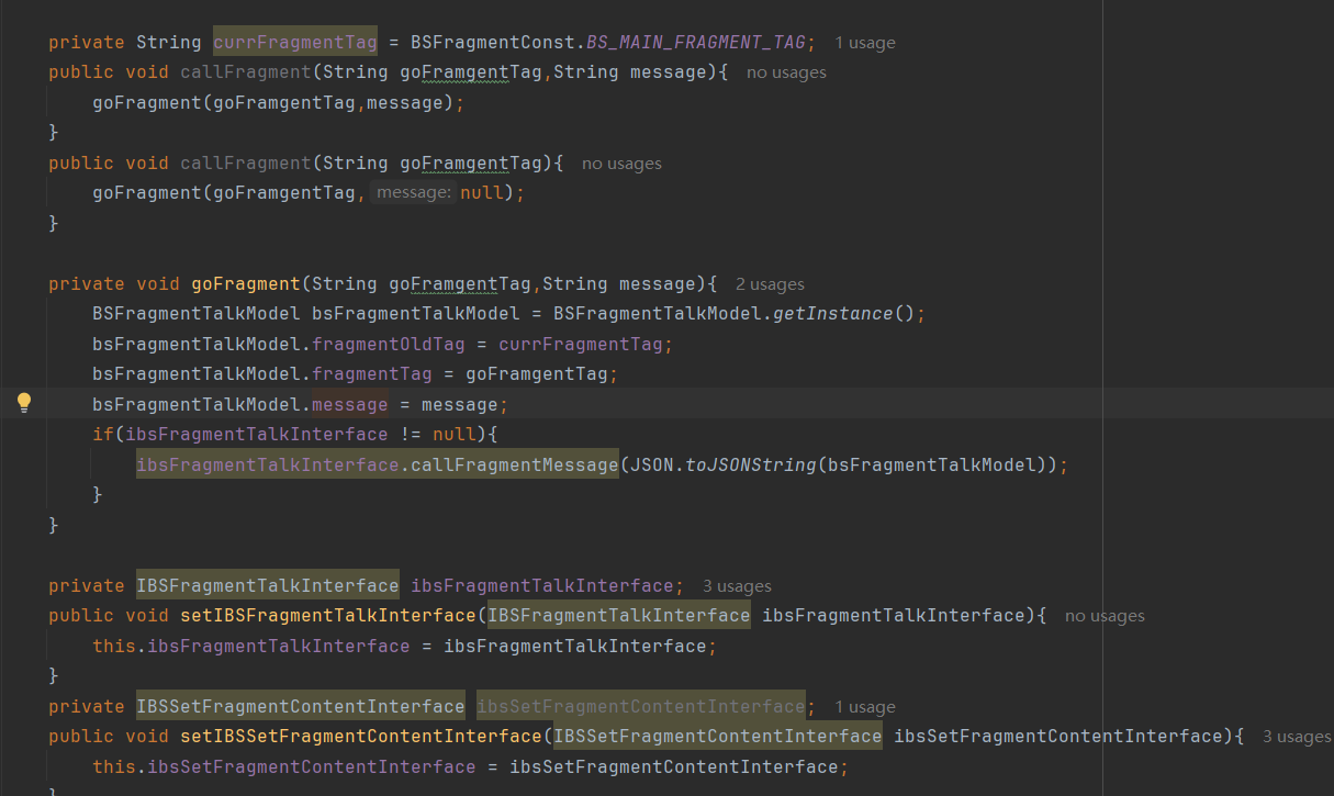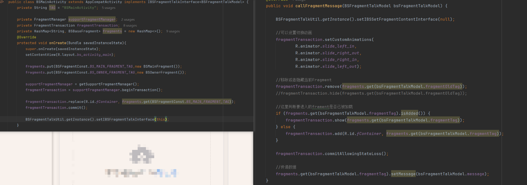 所有的操作方便都是依赖这个文件,当从 BSMainFragment切换到BSOwnerFragment时,只需传入 “ BSOwnerFragment ” 这个标签即可,当需要携带传输数据时,可以根据需要做扩展。